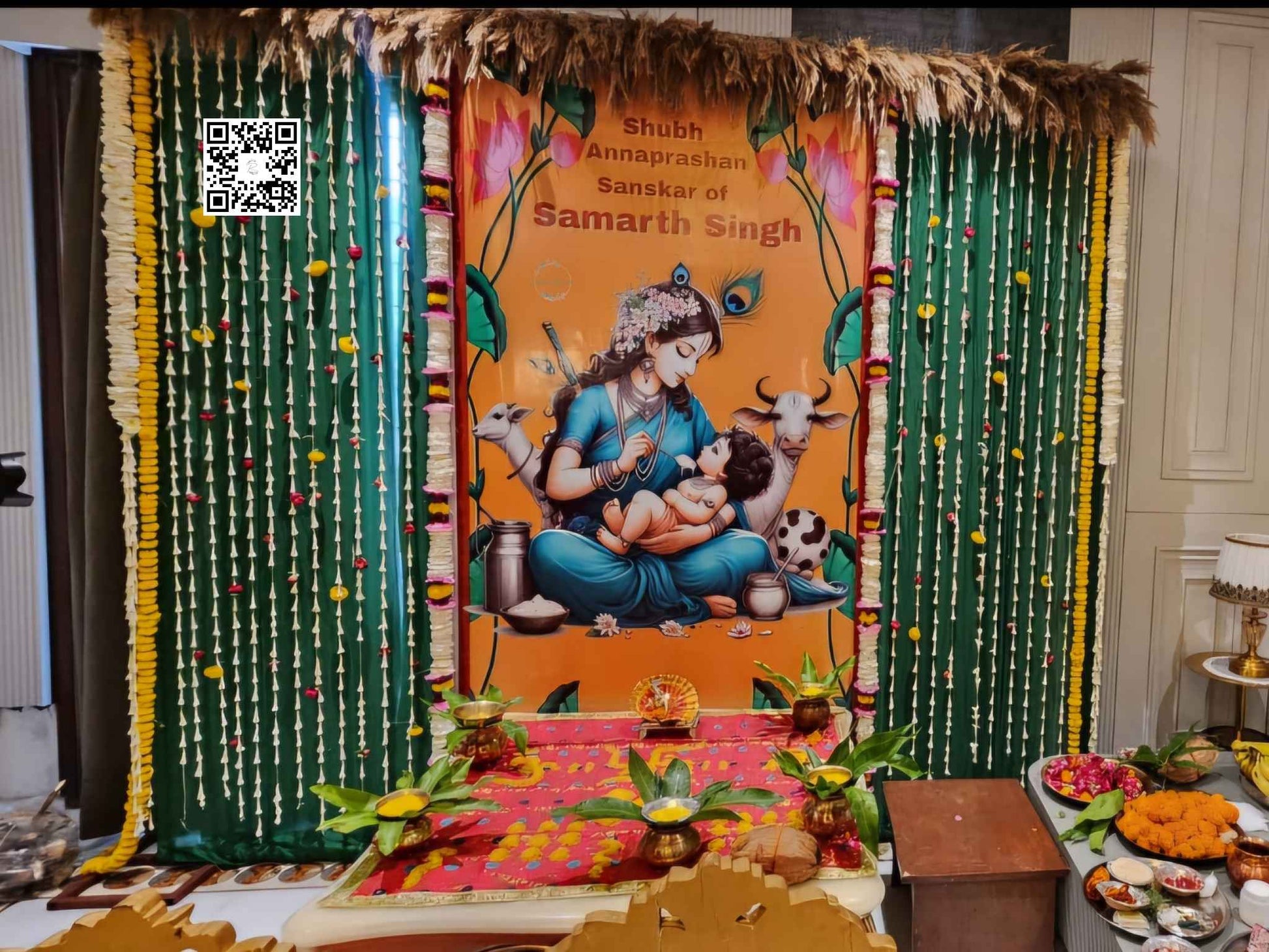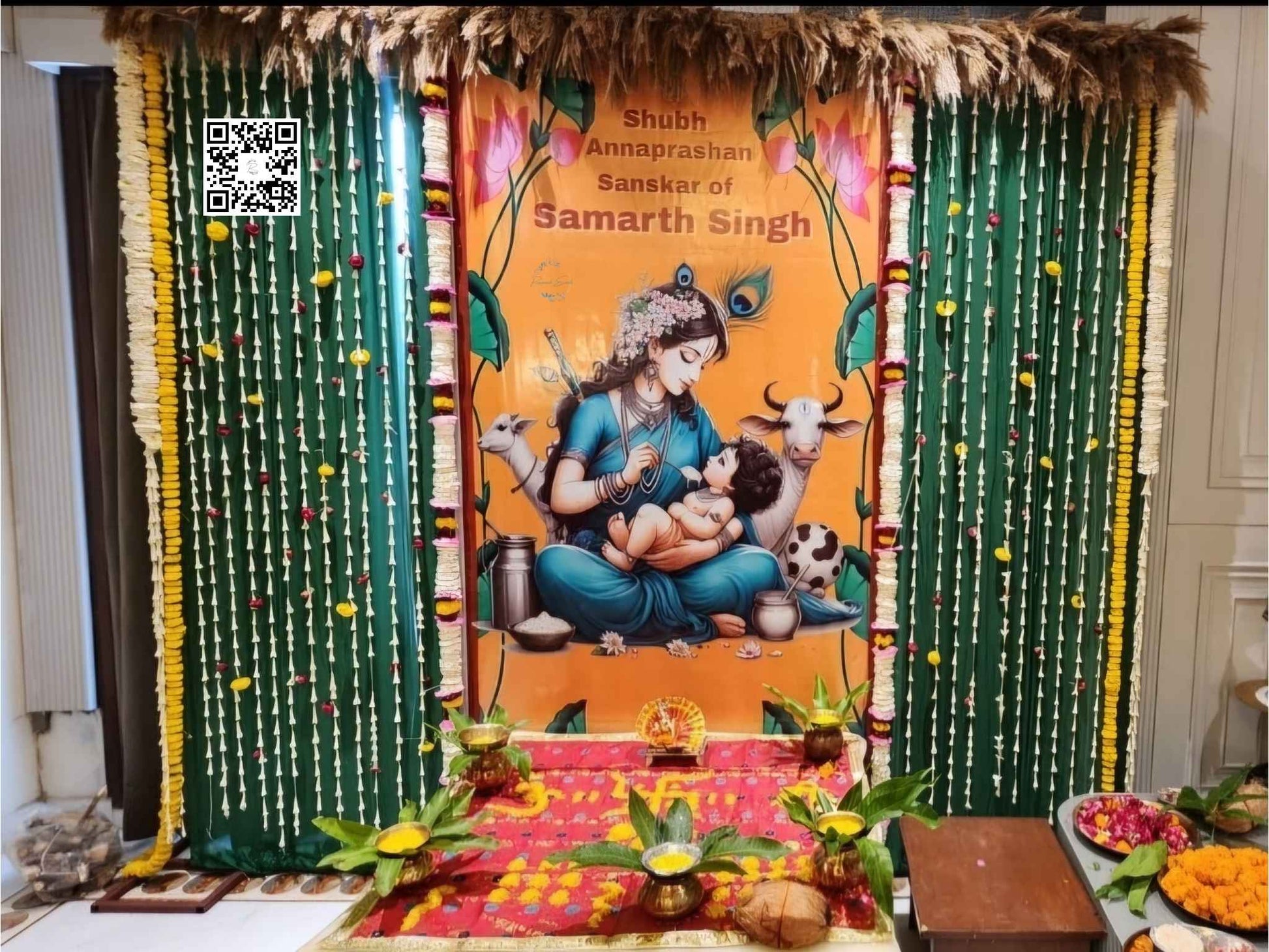 Create a charming atmosphere for your newborn's Annaprasan with our Backdrop decoration, featuring beautiful flowers and a printed backdrop. Perfect for capturing precious memories and creating a warm welcome for your little one.